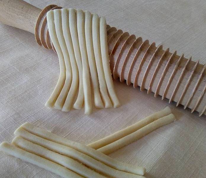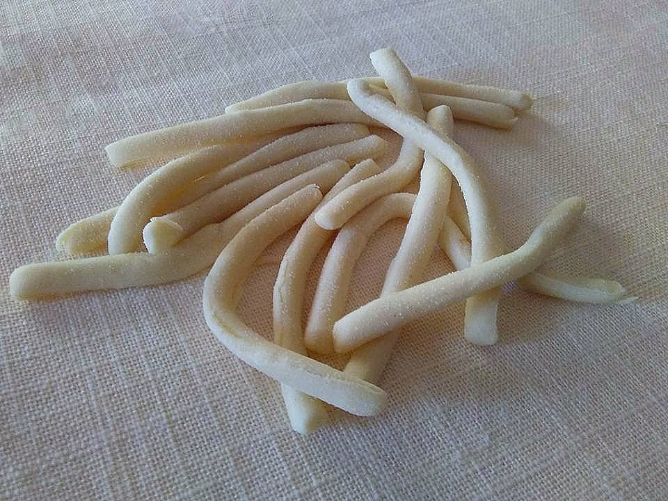 Dopo aver fatto riposare l’impasto stendo la pasta con il matterello o con l’Imperia (la macchinetta a manovella per la pasta detta anche Nonna Papera) usando il numero 1, cerco di ottenere delle strisce di pasta di circa 6 cm di altezza, poi passo sulle strisce il matterello tagliatelle strette e dopo averli staccati e rotolati velocemente tra le mani ecco pronti i filoncini, il resto poi si fa in un baleno.