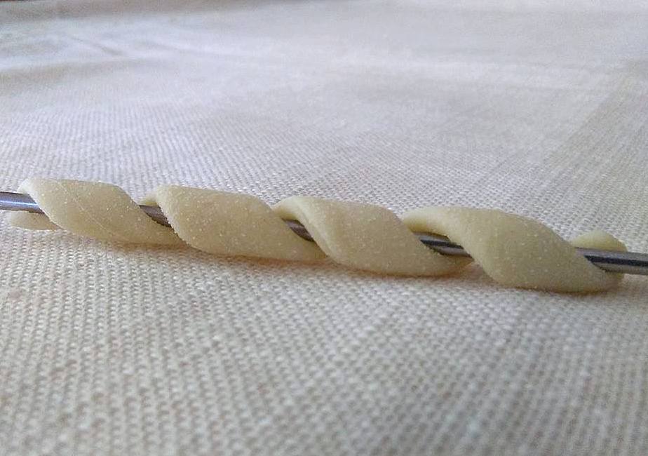 Cominciare a fare i fusilli, prendere il ferro adatto, poggiarlo con delicatezza sul filoncino e con movimento deciso ma senza premere molto formare il fusillo, tutto in un unico movimento (senza andare avanti e indietro e senza mettere la mano sul fusillo che si sta lavorando), sfilare il fusillo dal ferro e metterlo sul canovaccio, man mano che si formano metterli l’uno accanto all’altro lasciando un leggero spazio.