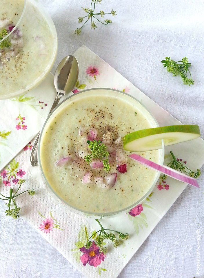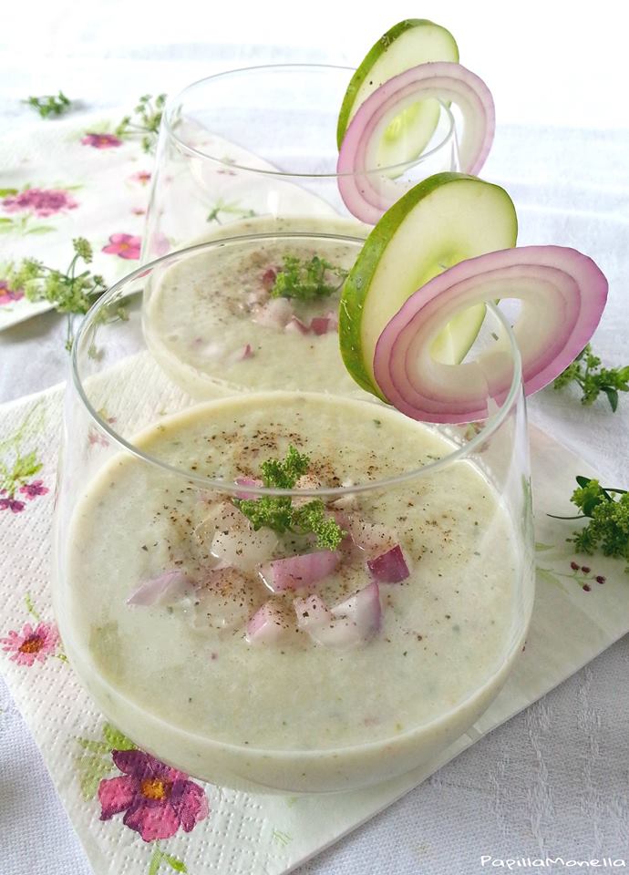 Cosa chiedere di meglio ad un singolo ortaggio? La freschezza del cetriolo, che se privato della buccia è anche altamente digeribile nonostante le credenze comuni, lo rende un ingrediente perfetto per ricette estive come questo gazpacho, dove ho voluto unirlo alla dolcezza della cipolla di Tropea e alle benefiche virtù dello jogurt di soia. Per dare carattere a questa fresca crema ho scelto semi di coriandolo biologici, che hanno esaltato e completato il gusto di tutti gli ingredienti.