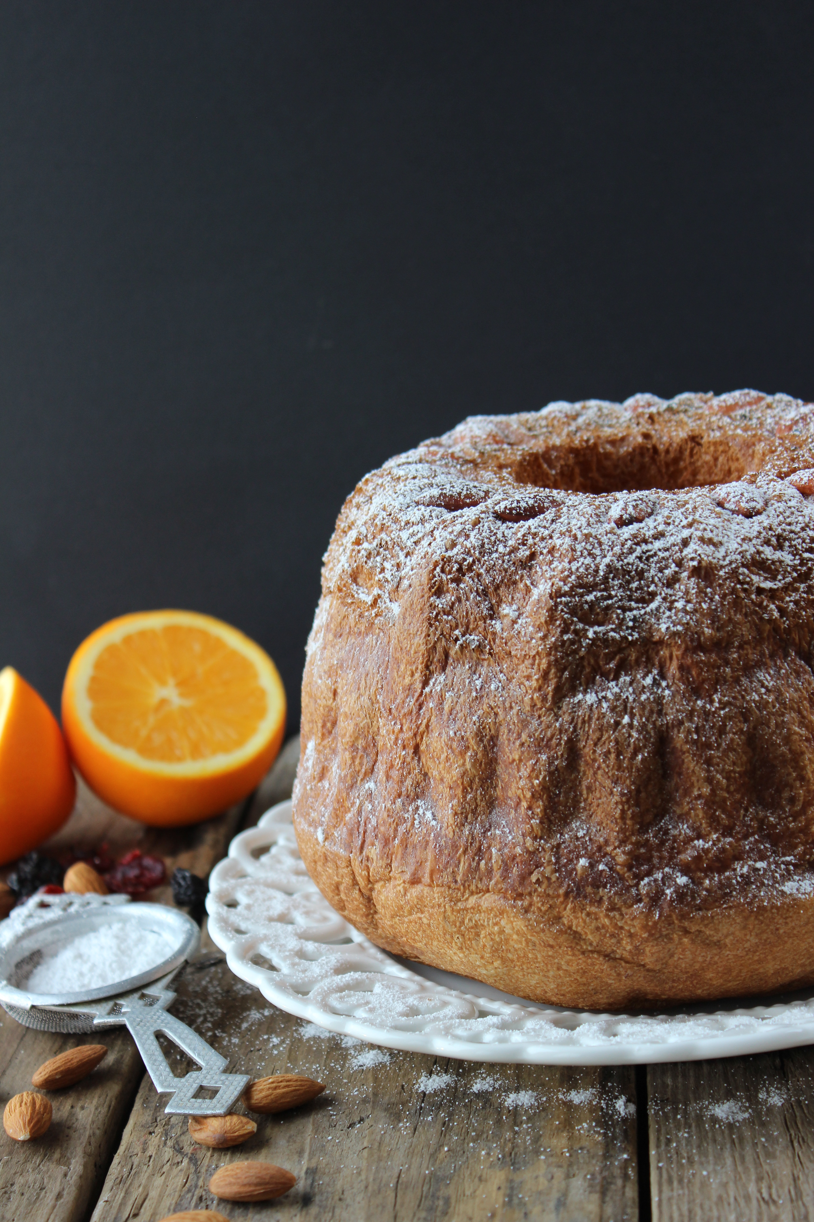 Il Gugelhupf, un soffice lievitato di origine nordica, dalla tipica forma, da me rivisitato a lievitazione naturale, e arrichito con arancia candita e frutti rossi, ottimo sostituto del tradizionale panettone.