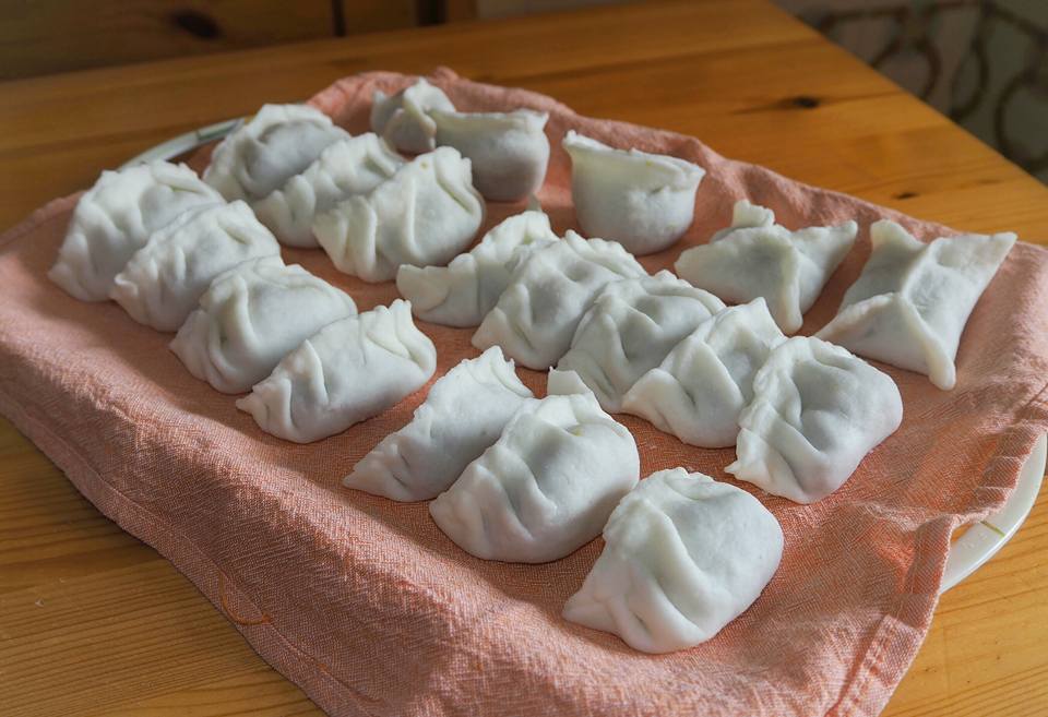 Farcire con un cucchiaio di ripieno e chiuderlo pizzicando il bordo per formare il Gyoza, o a mezzaluna classica.