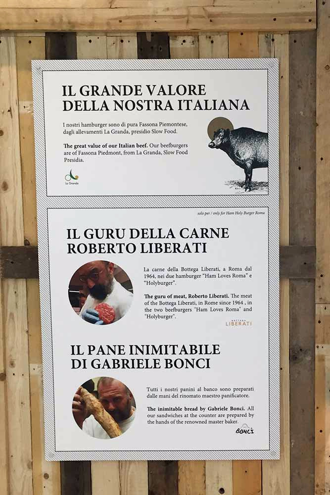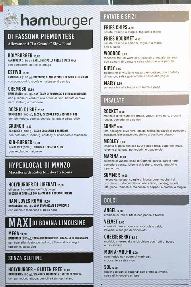 Nella gamma dei gourmet assolutamente da provare i classici Crunch (Hamburger di fassona piemontese Slow Food (180 g), con scamorza affumicata, bacon croccante, pomodoro, julienne di iceberg, maionese e chutney di pomodoro) o l’Holyburger anche in versione glutenfree (Hamburger di fassona piemontese Slow Food (180 g), con pomodori, cetrioli, lattuga, anelli di cipolla rossa e salsa holy). Davvero sfizioso anche il vegano Qui-no! (Hamburger di quinoa e zucchine, cheddar e maionese vegani con pomodori e julienne di carote), mentre per il KmZero l’Ham Loves Rome (Hamburger di manzo (180 g) della celebre Macelleria di Roberto Liberati e pane “rosetta” di Gabriele Bonci, uova strapazzate, guanciale, scaglie di pecorino, rucola e maionese al pepe nero).