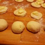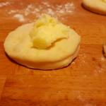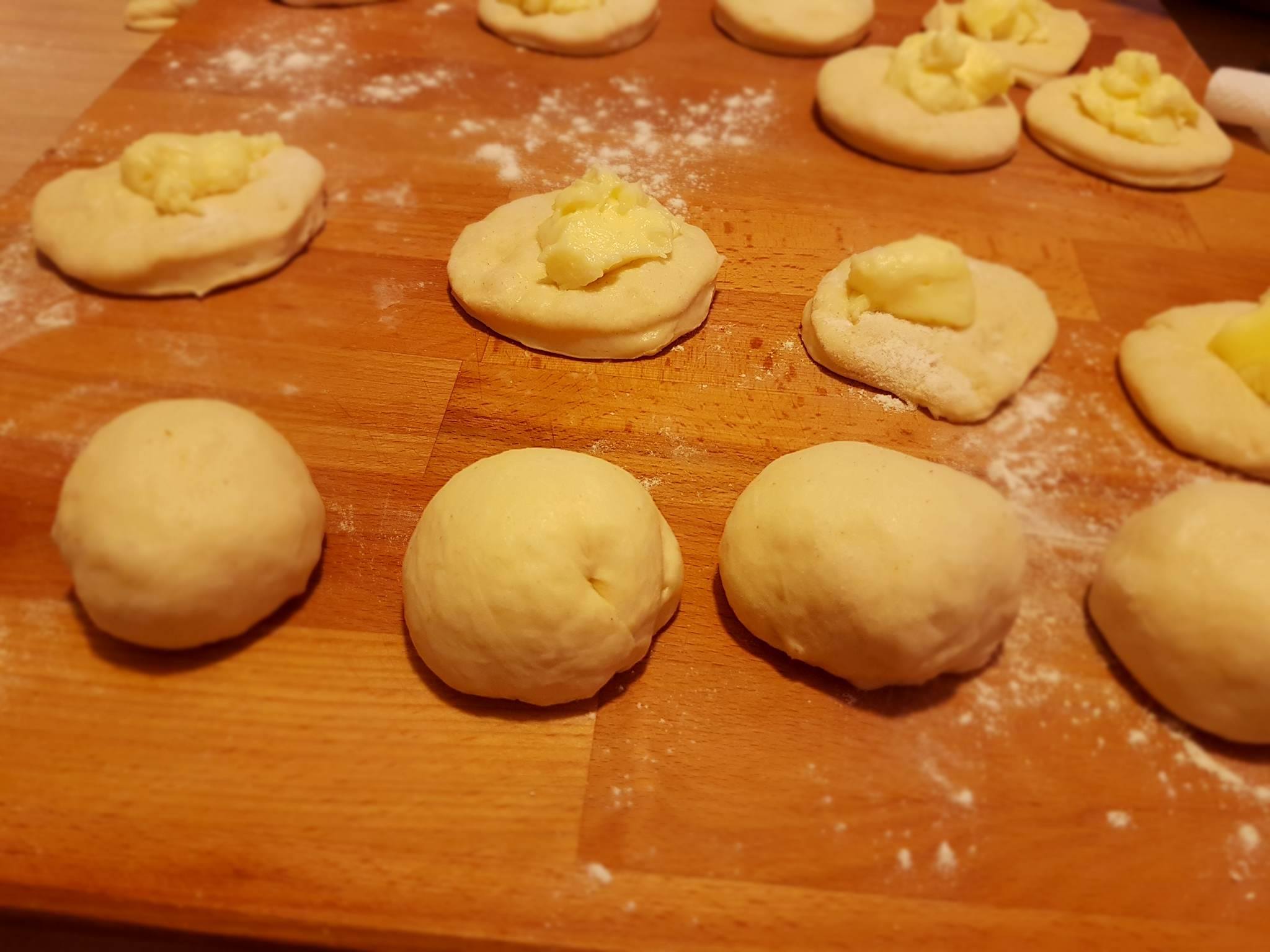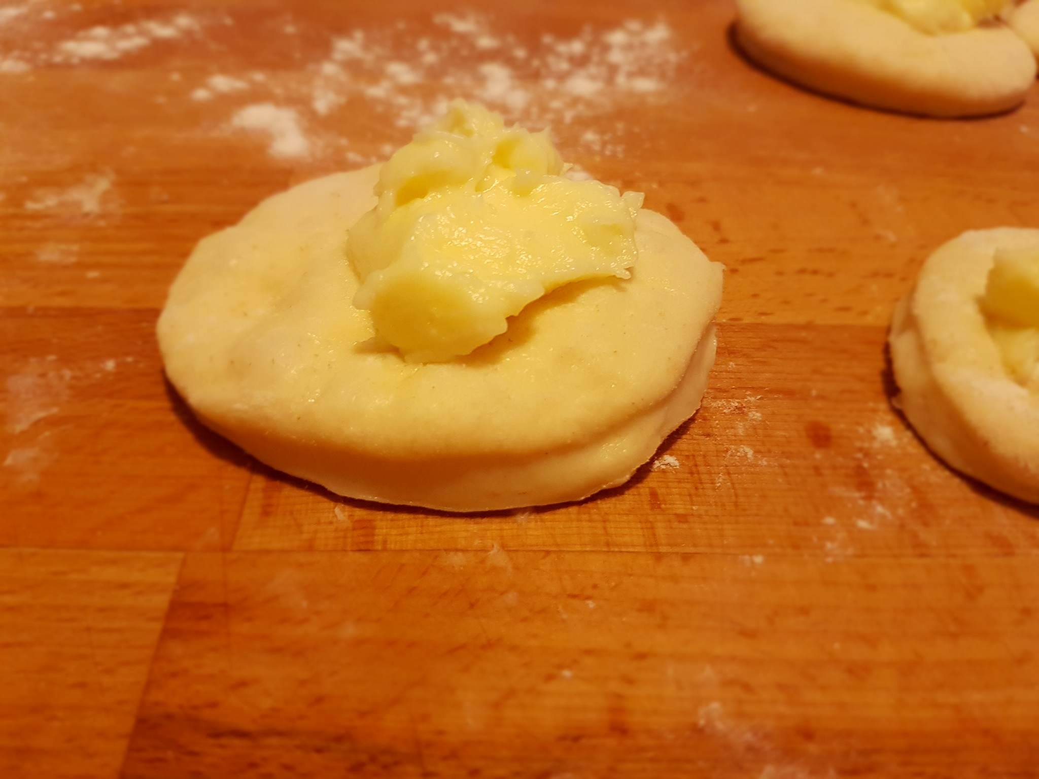 Quando l’impasto sarà lievitato, spolverizzare il piano con della farina e allargare dolcemente fino ad uno spessore di 1 cm scarso, coppare. Inserire al centro di ogni dischetto 1 o 2 cucchiaini di crema e richiudere a sacchettino stringendo bene le estremità e pirlare leggermente, arrotondando bene con la chiusura sotto.