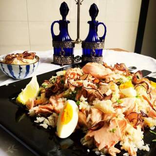 In un bel piatto, possibilmente caldo, mettete il riso, il salmone grossolanamente tagliato con le mani, le uova a pezzetti e le quasi tutte le cipolle ed il prezzemolo con molta delicatezza mescolate quindi guarnite con le cipolle rimaste, qualche pizzico di prezzemolo, le uova a spicchi e un paio di fette di limone.