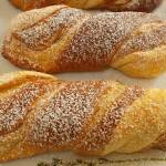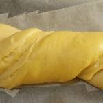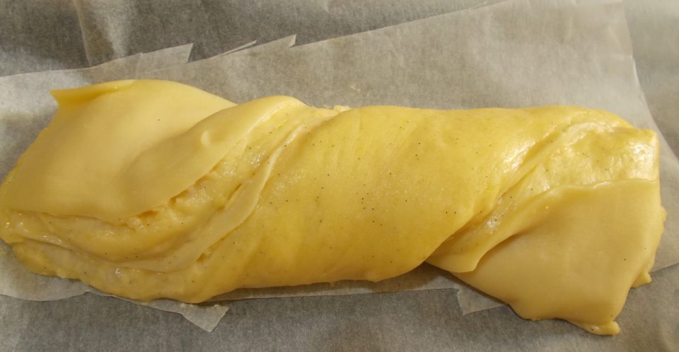 I due impasti vengono lavorati e attorcigliati insieme. Nella ricetta originale un leggero velo di confettura di albicocche, uvetta e canditi completano questa unione ma siccome sono ingredienti che io non amo particolarmente, ho optato per un ripieno di crema pasticcera.