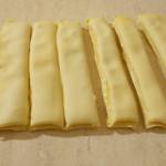 8) Tagliare delle striscioline lunghe circa 15 cm e large circa 2/3 cm. Arrotolare le striscioline ottenute a mo’ di caramella e disporle su di una teglia rivestita da carta forno ben distanziate.
