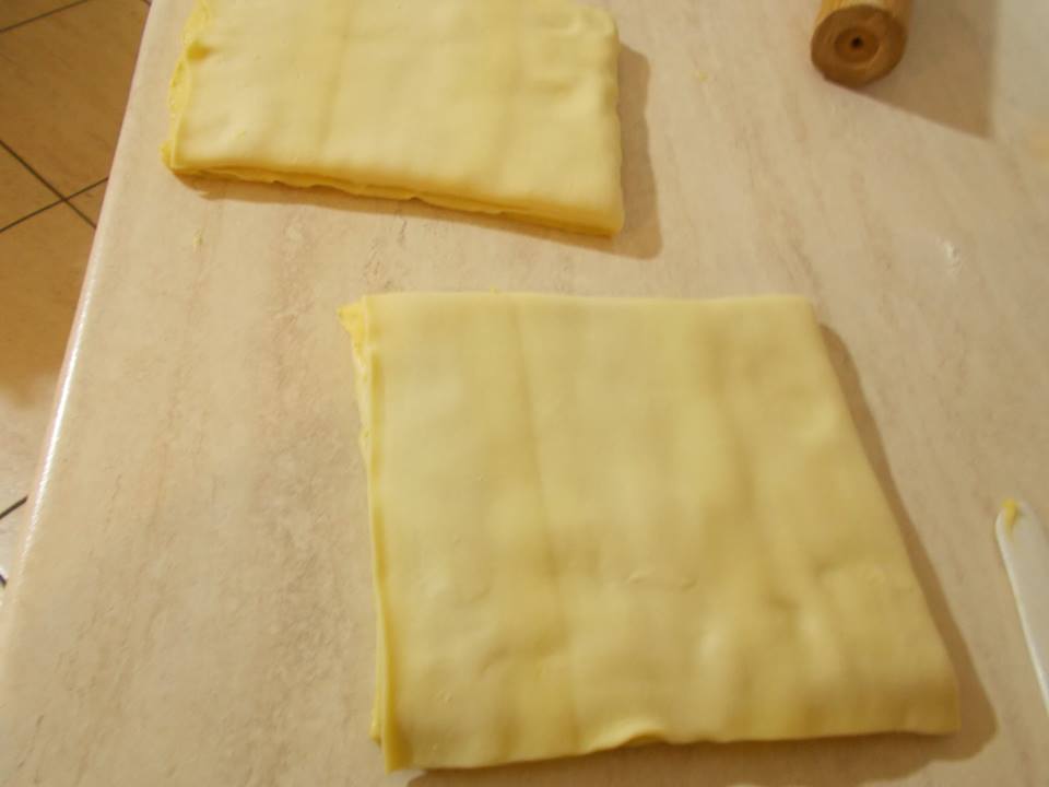 La pasta sfoglia è un insieme di due impasti: il panetto ( parte grassa che contiene il burro) e il pastello (parte magra)composto da acqua, farina e sale.