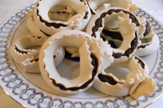 Per il ripieno: mettete a cuocere la saba in un pentolino insieme alla scorza grattugiata dell’arancia e ai semi d’anice. Aggiungete, in cottura, a poco a poco, la semola mescolando fino a quando non si avrà un composto denso al punto da poterlo lavorare con le mani. Alcuni aggiungono al composto anche un cucchiaio di cacao amaro. Lasciate raffreddare. Il composto ottenuto si chiama “pistiddu”.