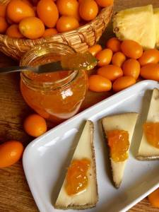 Ho preparato una marmellata dalle note un po’ “esotiche” con kumquat e ananas con il metodo farber e…..guarda caso ne è caduta un po’ su un caprino al pepe nero……non vi dico che delizia! secondo me oltre alla classica colazione questa marmellata accompagna molto bene formaggi dal gusto deciso, sia stagionati che freschi … se come me amate i formaggi, provate questo connubio !!!