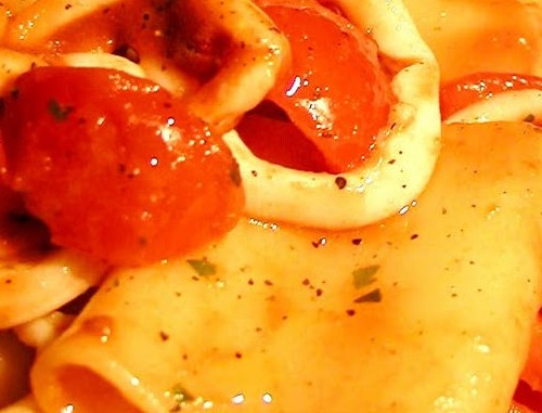 Separate gli anelli di calamaro dai tentacoli e fateli scottare velocemente nell’olio sfumando con mezzo bicchiere di vino bianco. Un paio di minuti dovrebbero bastare per dei calamari medi. Togliete gli anelli che se cotti troppo risulterebbero troppo duri, continuando la cottura dei tentacoli, unendovi i pomodorini tagliati in 4 e la passata di pomodoro.
