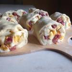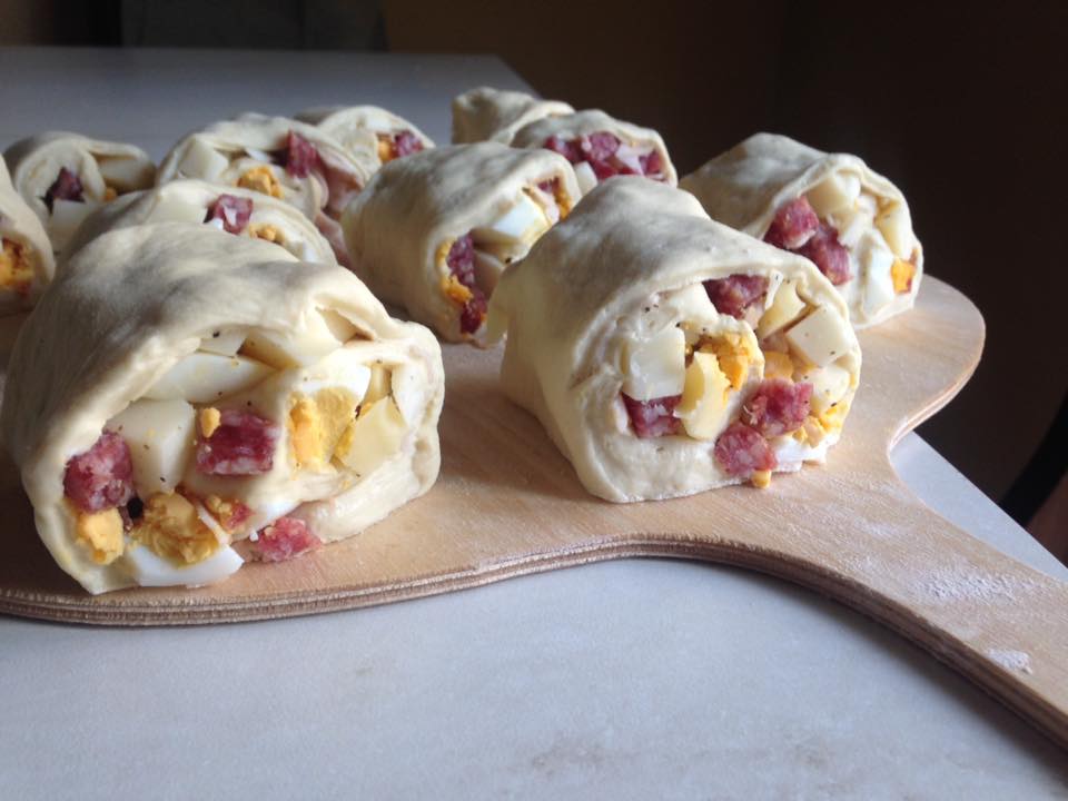 Ora prepariamo il ripieno , tagliamo i salumi le uova ed i formaggi a dadini, distribuiamo il ripieno in maniera omogenea sulle due sfoglie. Arrotoliamo la pasta con cura e poi taglimo in rotolini regolari.