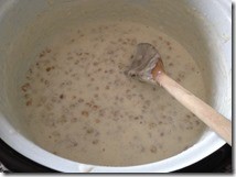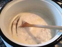 Mettiamo i semini della vaniglia nella ricotta ed il baccello nel latte insieme al grano precotto e facciamo sobollire fino a che non avremo raggiunto una bella consistenza densa, tipo crema pasticcera …