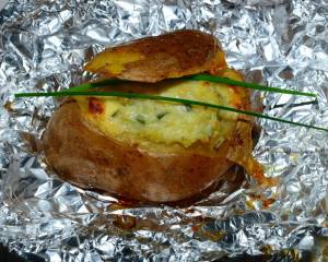 Schiacciare il ripieno con il gorgonzola, il latte e l’erba cipollina tritata. Con il composto ottenuto riempire le cavità formate nelle patate.