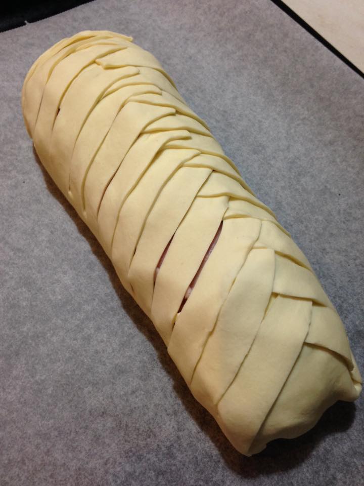Ritagliate le eccedenze dalla pasta e usatele per ritagliarvi delle striscioline decorative o delle formine da incollare al polpettone per abbellirlo, io l’ho intrecciato.