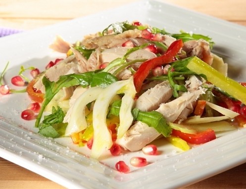 ROMA – Pollo lesso, peperoni, lattuga, finocchio e pochi altri ingredienti per avere un’insalata di pollo gustosa e originale. Una salsa base di senape per condire le verdure e dei chicchi di melograno la rendono davvero sfiziosa.