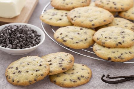 Ingredienti: 5 grammi di bicarbonato, 230 grammi di burro, 200 grammi di zucchero a velo, 2 grammi di estratto di vaniglia, 3 uova, 360 grammi di farina 00, 100 grammi di zucchero semolato, 10 grammi di sale grosso, 350 grammi di gocce di cioccolato fondente