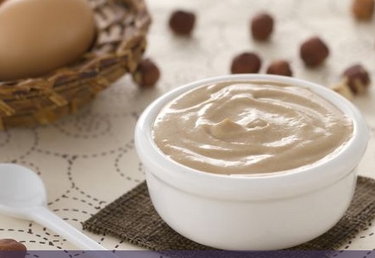 Ingredienti: 4 tuorli, 35 grammi di farina, 125 grammi di zucchero, 500 militri di latte, 15 grammi di amido di mais, 200 grammi di panna fresca, 180 grami di nocciole tritate.