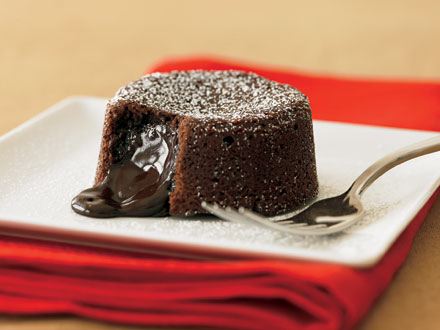 Se il tortino che avrete sfornato, aprendolo, avrà un cuore morbido e colante allora potrete sfornarli tutti. Smodellate i tortini dai pirottini e serviteli in piatti da dessert decorando il piatto con frutti rossi come ribes e una salsa di lamponi.