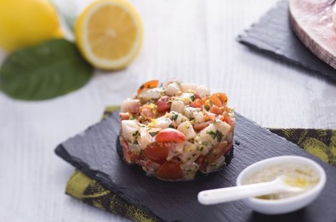 Ingredienti: 300 grammi di filetto di pesce spada, 25 grammi di scalogno, 3 grammi di capperi, 150 grammi di pachino, 3 grammi di basilico, 3 grammi di maggiorana, menta, prezzemolo, il succo e la scorza di un limone, 120 grammi di olio, sale e pepe