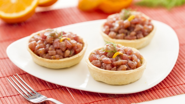 ROMA – Un modo semplice e veloce di preparare il tonno. La tartare viene condita con arancia e finocchietto, e servita in ciotole di pasta brisè.
