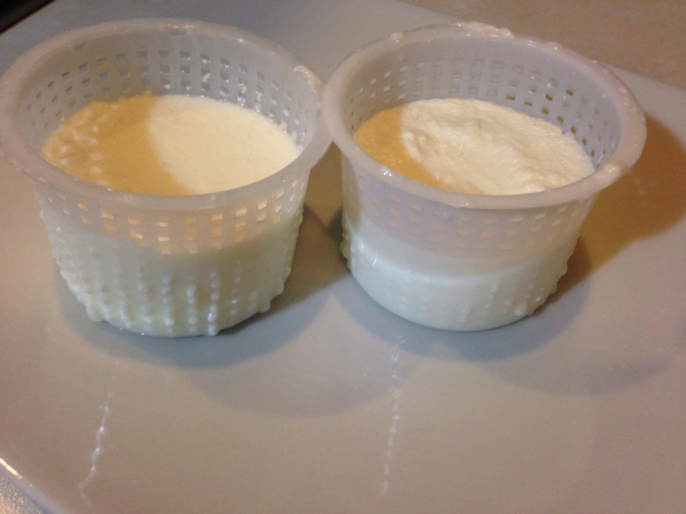 Raccogliete i fiocchi che si sono formati con un colino e metteteli a scolare nelle formine per ricotta.