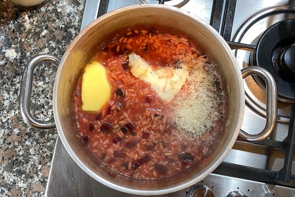 Cercare di arrivare a fine cottura con il riso abbastanza asciutto, spegnere la fiamma, aggiungere il burro e i formaggi, mescolare e mantecare per bene, quindi coprire e far riposare per 3 minuti. Scoprire, mescolare e valutare se il risotto è abbastanza morbido e cremoso, aggiungendo, se necessario, poco brodo.