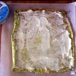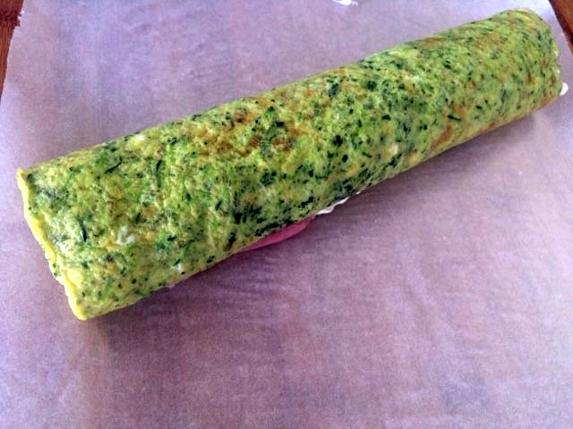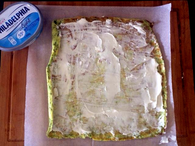 Arrotolarla su stessa e farla raffreddare per una 20 di minuti. Riprendere il rotolo, srotolarlo e spalmarci il philadelphia e il prosciutto cotto, arrotolarlo nuovamente e rimettere in frigo per farlo raffreddare.