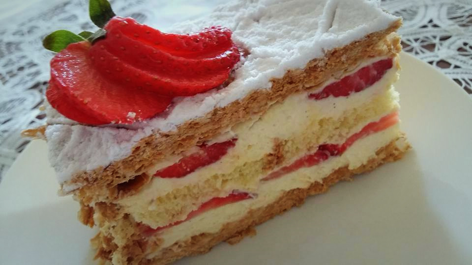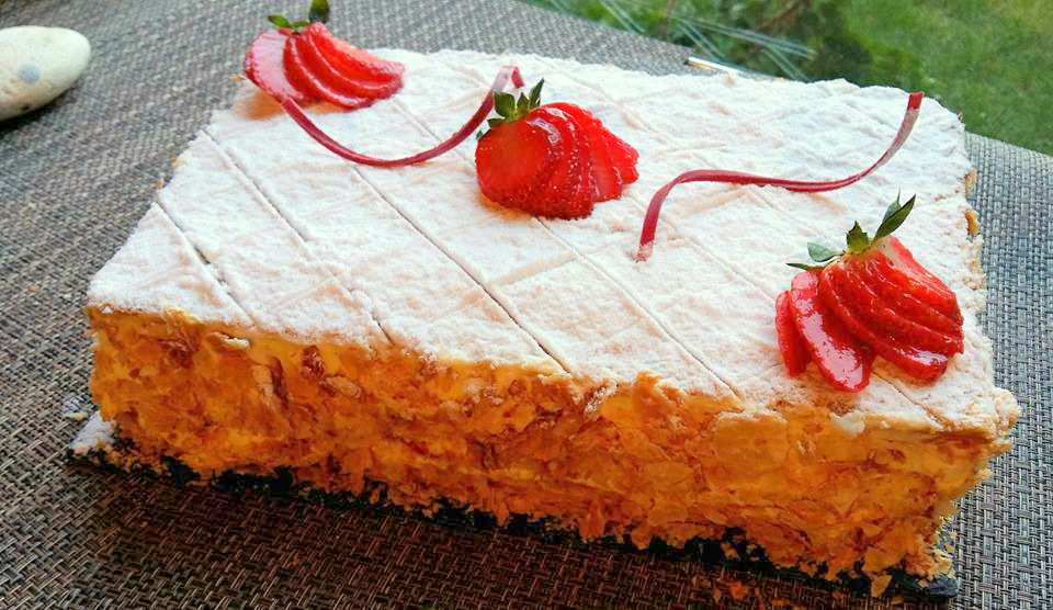 Mettere alla base un rettangolo di sfoglia ritagliato della misura giusta ( gli scarti li ho lasciati per la decorazione dei bordi), poi un generoso strato di chantilly, poi le fragole tagliate a fettine che vanno affondate leggermente nella crema per far aderire poi lo strato di pan di spagna inzuppato, poi ancora strato abbondante di chantilly e fragole che di nuovo ho affondato nella crema in modo che l’ultimo strato di sfoglia non scivolasse.