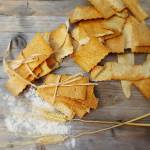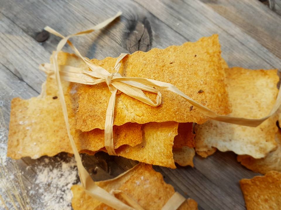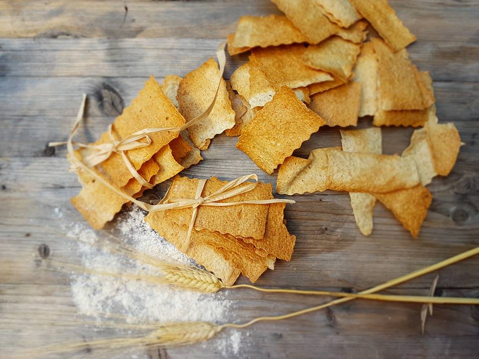 Non sono crakers, il gusto e la consistenza sono diversi… sono leggerissime e quasi trasparenti queste sfoglie di grano, sono tirate ad uno spessore di 1 mm con la Nonna Papera (la macchina per la pasta), gustose e saporite, si sente il gusto di una buona farina integrale, le mangi… ed una tira l’altra!