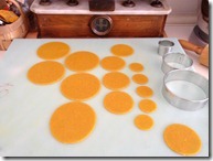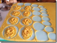 … stendiamo con un mattarello o con la sfogliatrice fino ad ottenere una sfoglia molto sottile e poi con un coppapasta di 3 dimensioni diverse ricaviamo dei cerchi come in foto (Foto A) …