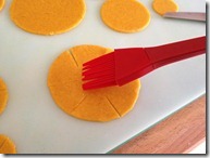 …facciamo 5 incisioni ai bordi per ogni cerchio di pasta (saranno i petali della rosa). Spennelliamo il centro dei cerchi di pasta (tranne il più piccolo) con un pò d’acqua o con un pò di albume e li mettiamo uno sull’altro dal più grande al più piccolo premendo alla fine al centro con un dito…
