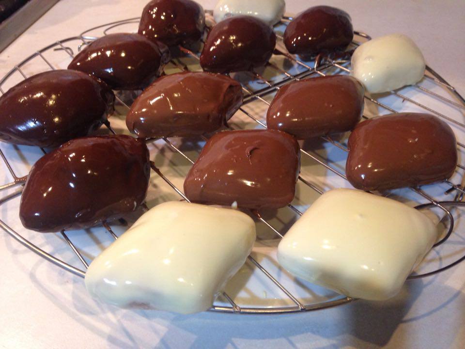 Sciogliete il cioccolato a bagnomaria in un recipiente abbastanza largo e immergete i biscotti uno alla volta ricoprendoli con il cioccolato. Potete usare sia il cioccolato fondente, al latte o bianco.