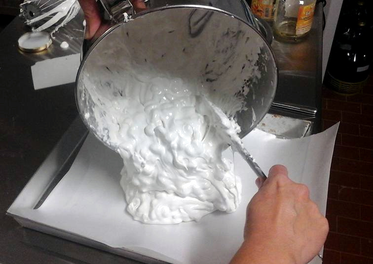 Versare lo zucchero liquido a 152°C a filo in planetaria e far girare a media velocità finché non perderà lucentezza.