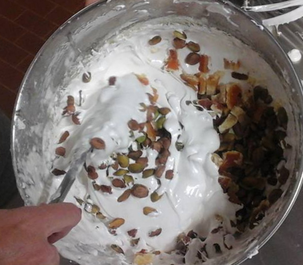 A questo punto inserire la frutta secca ancora calda (mandorle o nocciole tostate) e mescolare per bene.
