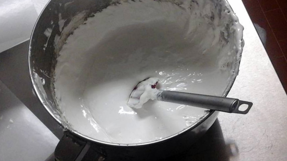 Montare l’albume in planetaria con la frusta a velocità bassa. Mettere acqua e zucchero sul fornello e appena arrivato a ebollizione aggiungere il glucosio e portiare a 152°C.