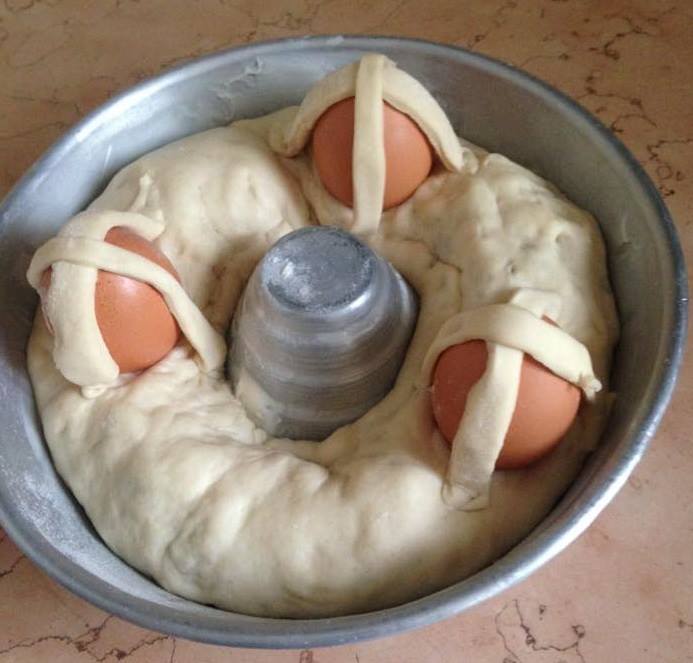 Quando il casatiello avrà lievitato disponete le uova su di esso e fermatele con delle striscioline incrociate fatte con la pasta che avete tenuto da parte, infornatelo a forno già riscaldato a 160°C per i primi 10 minuti poi a 170°-180°C per un’ora di cottura.