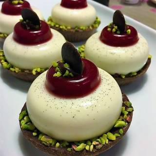 Versare la ganache sopra lo strato di geleè ai lamponi fino al bordo delle tartellette e guarnire con la granella di pistacchio.