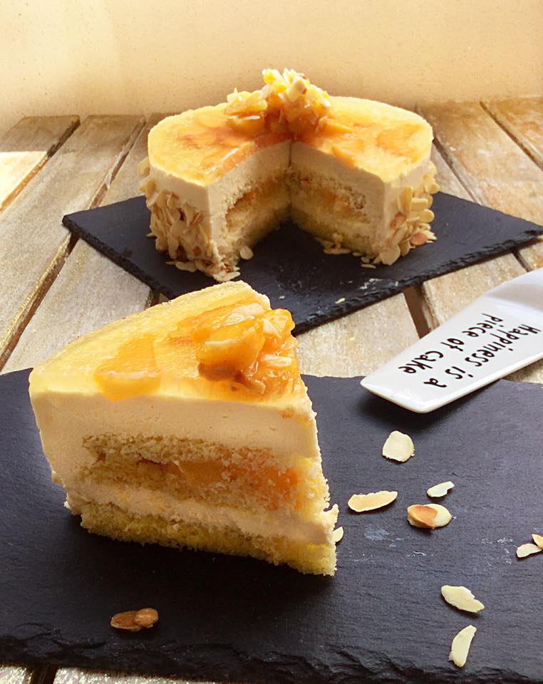 Montaggio: rivestire un coppapasta con la pellicola alimentare e lungo il bordo con una striscia di acetato. Sul fondo disporre le fettine di pesca, colare l’aspic e trasferire in freezer a congelare, dopodiché aggiungere una parte di mousse, il disco di pan di spagna (chiuso a panino) fatto precedentemente, l’altra parte di mousse e infine chiudere con l’ultimo disco di pan di spagna. Una volta congelata togliere il coppapasta e trasferire in frigorifero 6/8 ore prima di consumarla. Guarnire con tocchetti di pesca e filetti di mandorle.