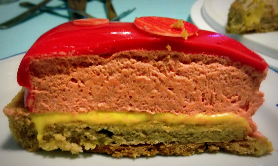 Sformare la Mousse di lampone, glassarla e adagiarla sulla base estratta dal freezer.