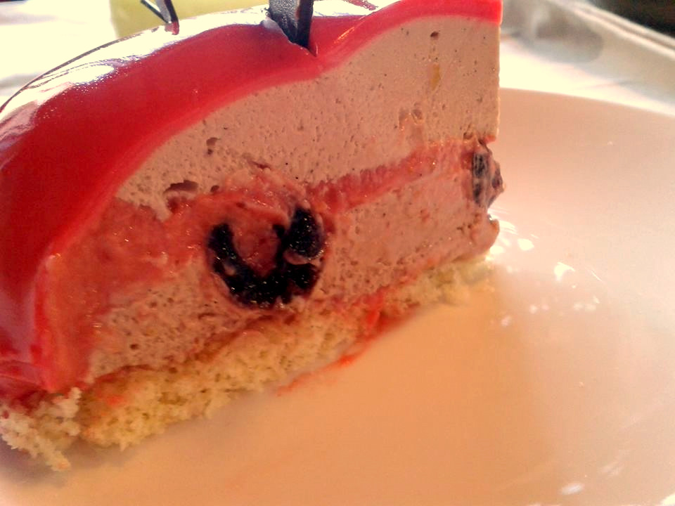 Mescolare la purea di ciliegie, lo zucchero e il succo del limone. Portare al bollore e unirli alle uova intere miscelate con i tuorli e far cuocere fino alla temperatura di 82°C. Togliere dal fornello, aggiungere la gelatina e il burro a pezzetti. Versare uno strato nello stampo sopra la mousse solidificata, nella giusta quantità inserendo anche qualche amarena intera oppure piccoli pezzetti, mi raccomando che siano scolate bene e tamponate con carta da cucina. Mettere in congelatore a solidificare e poi colare sopra ancora uno strato di mousse fino ad arrivare quasi al bordo.