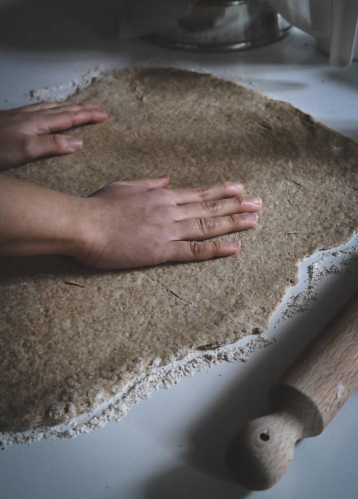 4 – stendiamo con un matterello fino a formare un grosso rettangolo dello spessore di circa 5 mm;