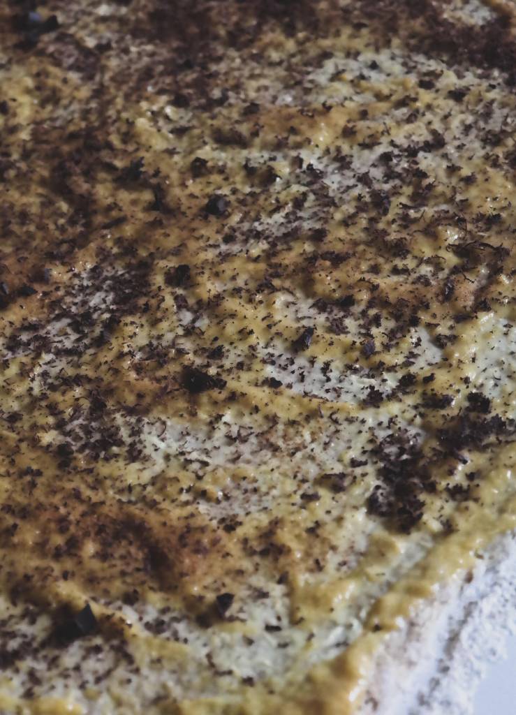 6 – aiutandoci con una grattugia o con un coltello, riduciamo in scaglie il cioccolato ricoprendo tutta la superficie della pasta. Se preferite sentire il sapore della cannella, aggiungetene ancora in questo passaggio;