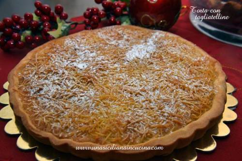 Come ci racconta nel suo Blog Una siciliana in cucina La torta con tagliatelline è una rivisitazione della torta ricciolina o tagliatelle di Ferrara formata da una base di pasta frolla con all’interno una crema di mandorle decorata con sottili tagliatelle, bagnate da liquore alla mandorla, che danno croccantezza a tutta la torta. Per preparare questa torta, che io adoro, ho preso spunto dalla ricetta originale e dalla sua storia che ho trovato sul sito http://www.ferraraterraeacqua.it/: La Torta di tagliatelle è un dolce tipico della tradizione emiliana. E’ molto conosciuta nei paesi dell’Appennino Tosco-Emiliano, ma è anche molto diffusa nel ferrarese e persino nella provincia di Mantova (dove viene preparata senza il guscio di frolla). E’ una torta antica, pare che abbia origini rinascimentali e che le “tagliatelle fini” che ne decorano la superficie non siano altro che un omaggio alla bionda chioma di Lucrezia Borgia, signora del Castello Estense di Ferrara per quasi un ventennio.