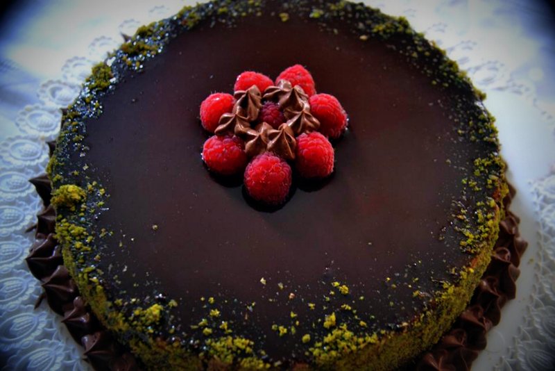 Torta pistacchio, ricotta, lamponi glassata al cacao una torta che nasconde al suo interno più strati di golosa dolcezza… Ideale da preparare per un’occasione speciale e volete stupire i vostri ospiti.