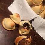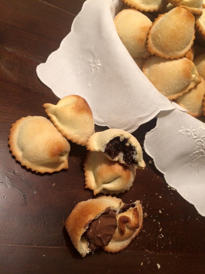 Mettere al centro il ripieno preparato ( in alternativa Nutella), inumidire leggermente e chiudere dando la forma di tortelli.