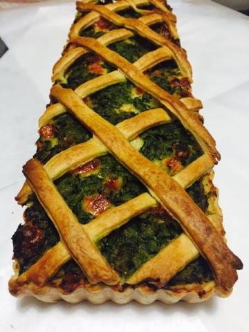 Con i ritagli della pasta sfoglia ricavare delle striscioline per creare la classica decorazione a losanga sulla superficie della torta salata.