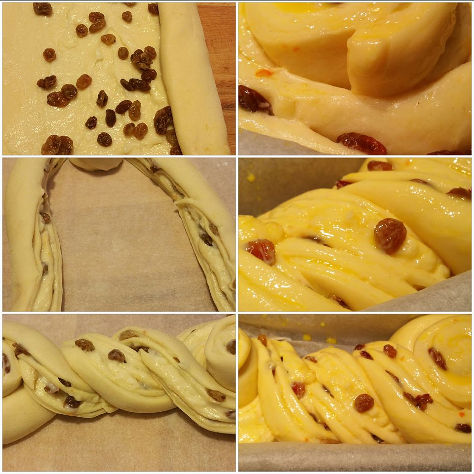 Stendere un velo di crema, l’uvetta ammollata precedentemente con acqua e rum ,arrotoliamo dal lato lungo stringendo bene ,chiuso il rotolo tagliamo un estremità da 4 cm, sezioniamo la treccia a meta lasciando unita l’altra estremità.