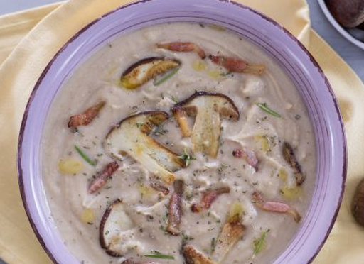 Trascorso il tempo necessario, le castagne si saranno ben ammorbidite: spegnete il fuoco e frullatele con un frullatore ad immersione finché non otterrete una crema densa. A questo punto passate la vellutata in un colino a maglie strette fino ad ottenere una crema liscia ed omogenea; trasferitela in un piatto di portata, guarnendola con i funghi e il guanciale croccante che avete preparato.