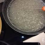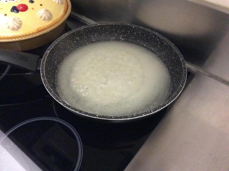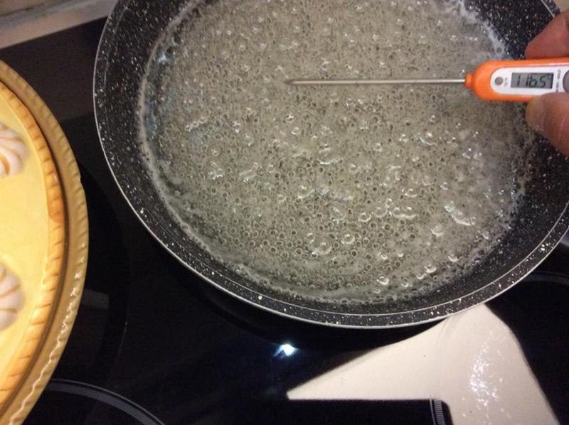Munirsi di un termometro da cucina, mettere tutti gli ingredienti in un pentolino, porlo sul fuoco a fiamma bassa e, rimestando con una piccola frusta, sciogliere il tutto finché non abbia raggiunto una temperatura di 116°C.