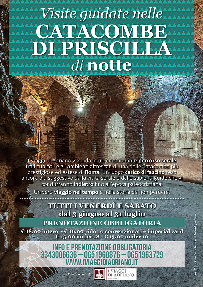 Grande occasione per i romani e non solo: dal 3 giugno e per tutto luglio potranno godere delle Catacombe di Priscilla anche di notte. Il visitatore -sapientemente condotto da guide specializzate- avrà la possibilità di visitare e scoprire nella suggestione notturna le meravigliose Catacombe di Priscilla: le più importanti e note della Via Salaria, che custodiscono straordinari tesori tra affreschi e reperti di indiscussa importanza. Un percorso studiato per immergerci tra gli straordinari cubicoli ed i tesori che la catacomba custodisce.